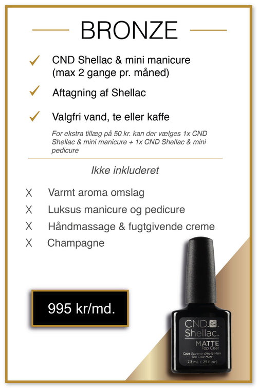 Få smukke negle med vores Bronze Shellac-abonnement! Med Bronze-abonnementet vil du modtage 2x CND Shellac-behandlinger, en Mini Manicure og fjernelse af Shellac hver måned.